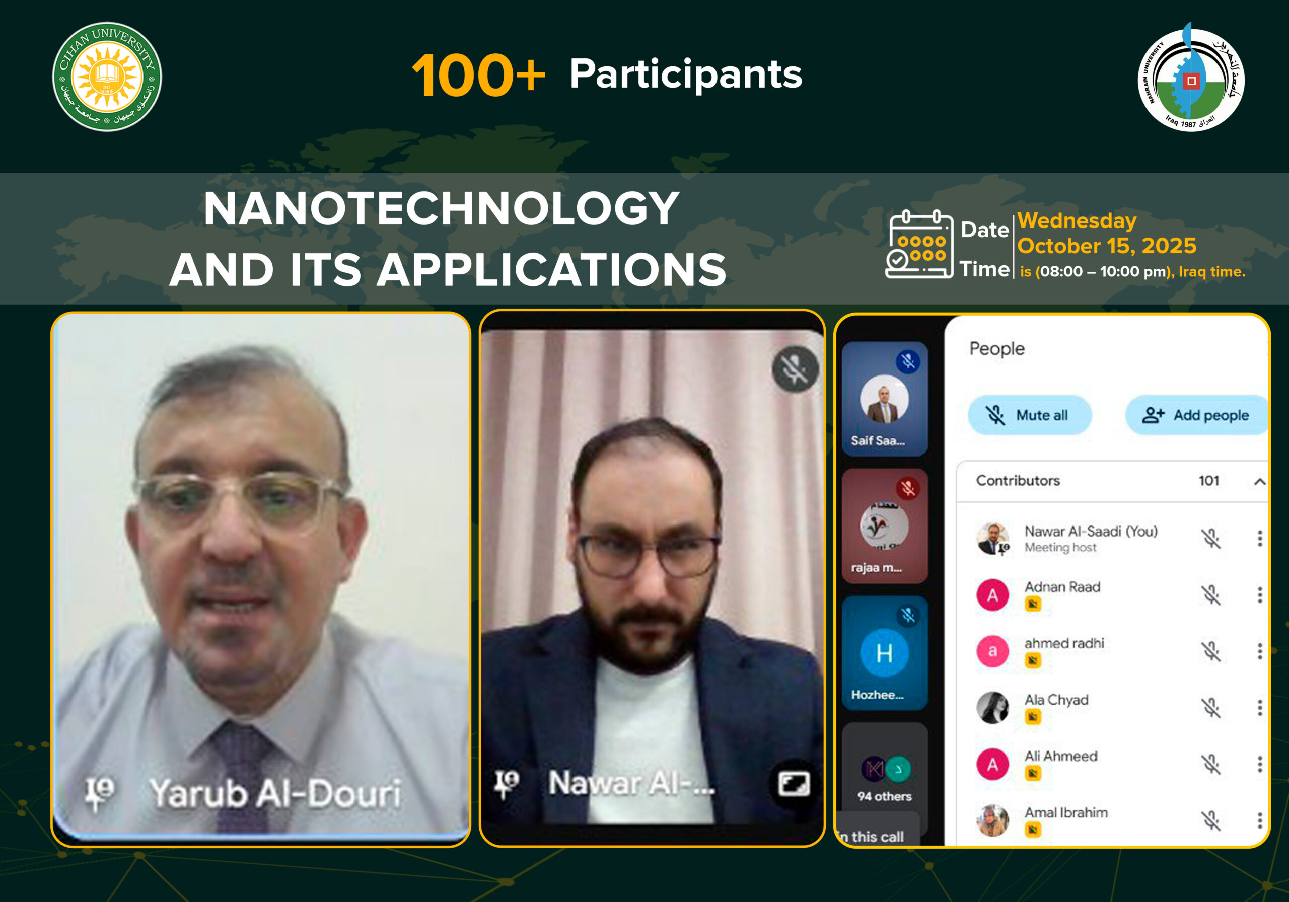 On Wednesday, October 15, 2025, the Consulting & Research Centre at Cihan University – Duhok, in collaboration with the College of Business Economics at Al-Nahrain University in Baghdad, organized an international webinar titled “Nanotechnology and Its Applications”. The event brought together over 100 participants, including academics and specialists from Iraq and abroad.